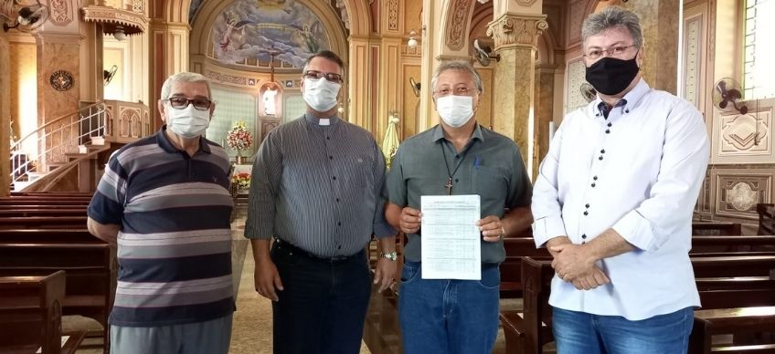 O prefeito Padre Osvaldo junto ao secretário de planejamento, Walter Agudo Romão apresentaram, em primeira mão, aos Padres Fábio e Silvio, o projeto prévio para reforma da Igreja Matriz de São Domingos. O investimento previsto será de R$ 125 mil.