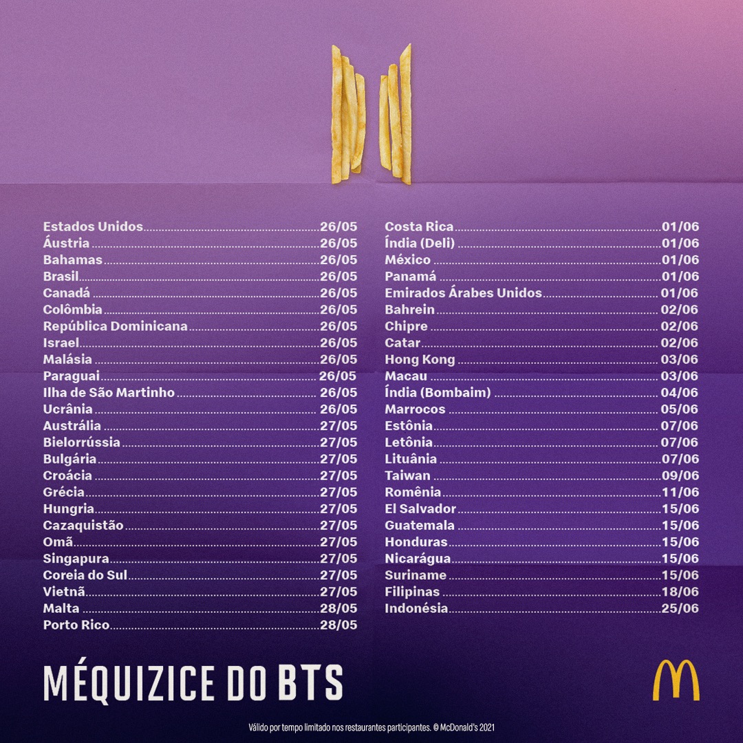 Essa turnê única chegará ao Brasil no dia 26 de maio, quando os clientes poderão degustar a Méquizice assinada pelo grupo nos restaurantes participantes no país. A novidade inclui Chicken McNuggets® com 10 unidades, McFritas Média, Coca-Cola média, além dos molhos Sweet Chili e Cajun, que são inspirados em receitas populares do McDonald's da Coreia do Sul.