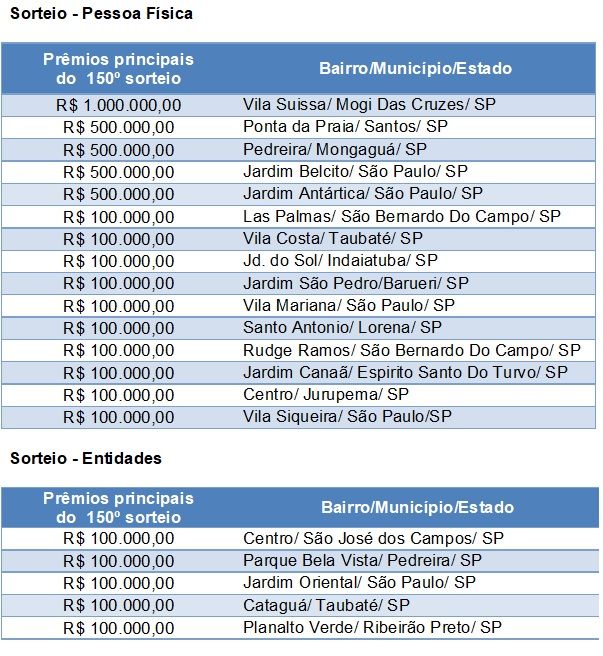 No sorteio exclusivo para as entidades filantrópicas, cinco instituições foram premiadas com R$ 100 mil cada. São elas: a Irmandade da Santa Casa de Misericórdia, de São José Dos Campos; o Lar dos Velhos Flaminio Mauricio, de Pedreira; a Associação de Proteção e Valorização da Vida Animal, de São Paulo; a Associação de Pais e Amigos dos Excepcionais, de Taubaté; e o Centro de Ativid. Educac. Especializadas, de Ribeirão Preto. Outras 50 instituições foram sorteadas com prêmios de R$ 10 mil, somando o valor de R$ 1 milhão.
