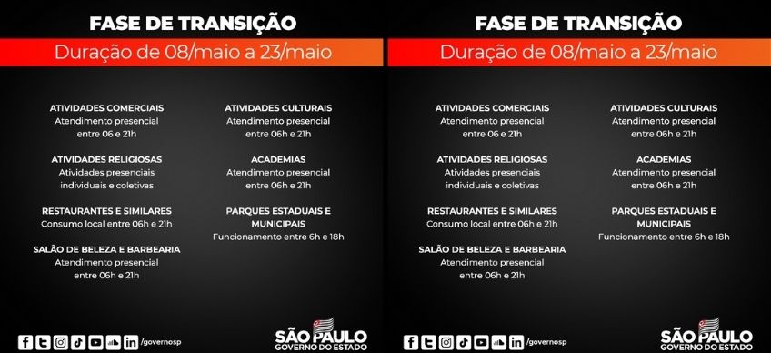 O Governo de SP prorrogou para 23 de maio a fase de transição do Plano São Paulo para todo o estado. A medida, que entra em vigor no próximo sábado, é resultado da redução gradual de indicadores de casos, internações e mortes por COVID-19.