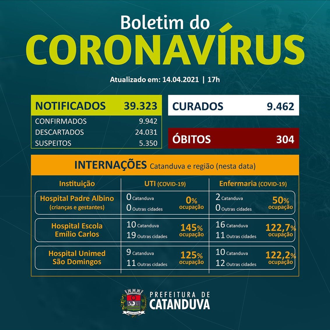 Boletim do coronavírus em Catanduva. Atualmente, 9.942 casos foram confirmados para a doença. São 77 novos registros no comparativo com o último boletim.