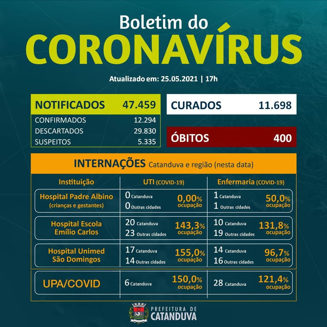 Boletim do coronavírus em Catanduva. Atualmente, 12.294 casos foram confirmados para a doença. São 114 novos registros no comparativo com o último boletim.