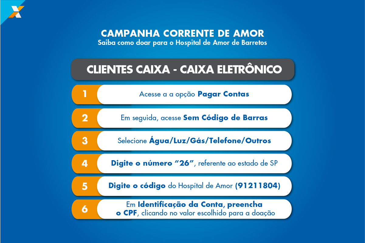 Os clientes que contribuem pelos canais da CAIXA com um valor mínimo de R﹩ 10 participam de diversos sorteios de prêmios pela campanha Corrente do Amor, organizada pela instituição que administra o hospital. Os doadores recebem números da sorte para participação nos sorteios.