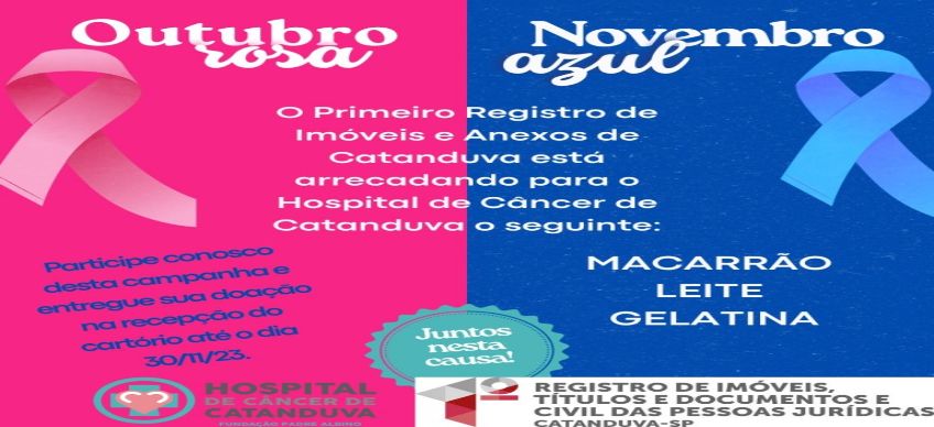 Seja câncer de mama, de próstata ou qualquer outro, a união faz as coisas acontecerem. Pensando nisso, o Cartório 1º Registro de Imóveis de Catanduva está promovendo campanha, alusiva ao Outubro Rosa e Novembro azul, para coleta de alimentos para o Hospital de Câncer de Catanduva.
