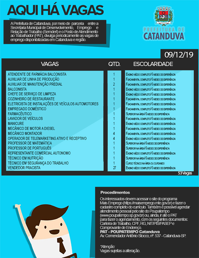 A Prefeitura de Catanduva, por meio de parceria entre a Secretaria Municipal de Desenvolvimento, Emprego e Relação de Trabalho (Semdert) e o Posto de Atendimento ao Trabalhador (PAT), divulga periodicamente as vagas de emprego disponibilizadas em Catanduva e região.