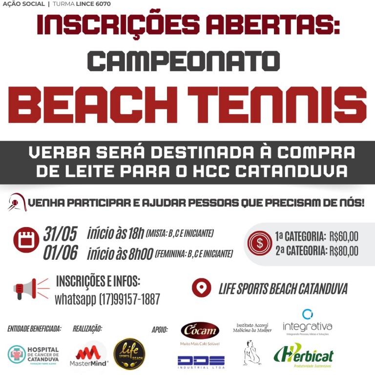 A MasterMind e a Life Sports Beach estão com inscrições abertas para o Campeonato de Beach Tennis pró-Hospital de Câncer de Catanduva que acontece nos dias 31 de maio e 1º de junho.