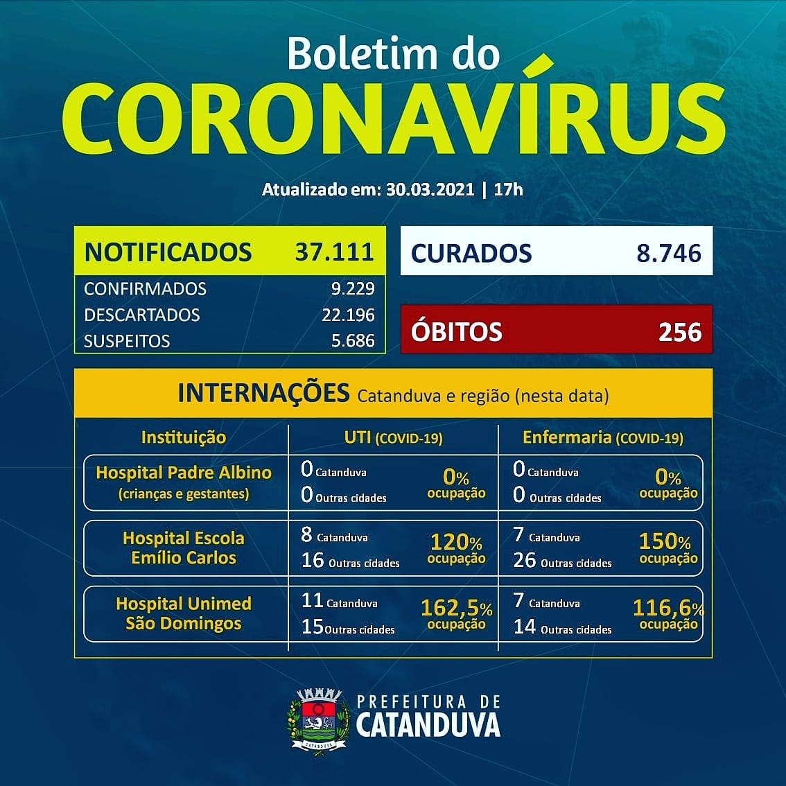 Boletim do coronavírus em Catanduva. Atualmente, 9.229 casos foram confirmados para a doença. São 67 novos registros no comparativo com o último boletim.