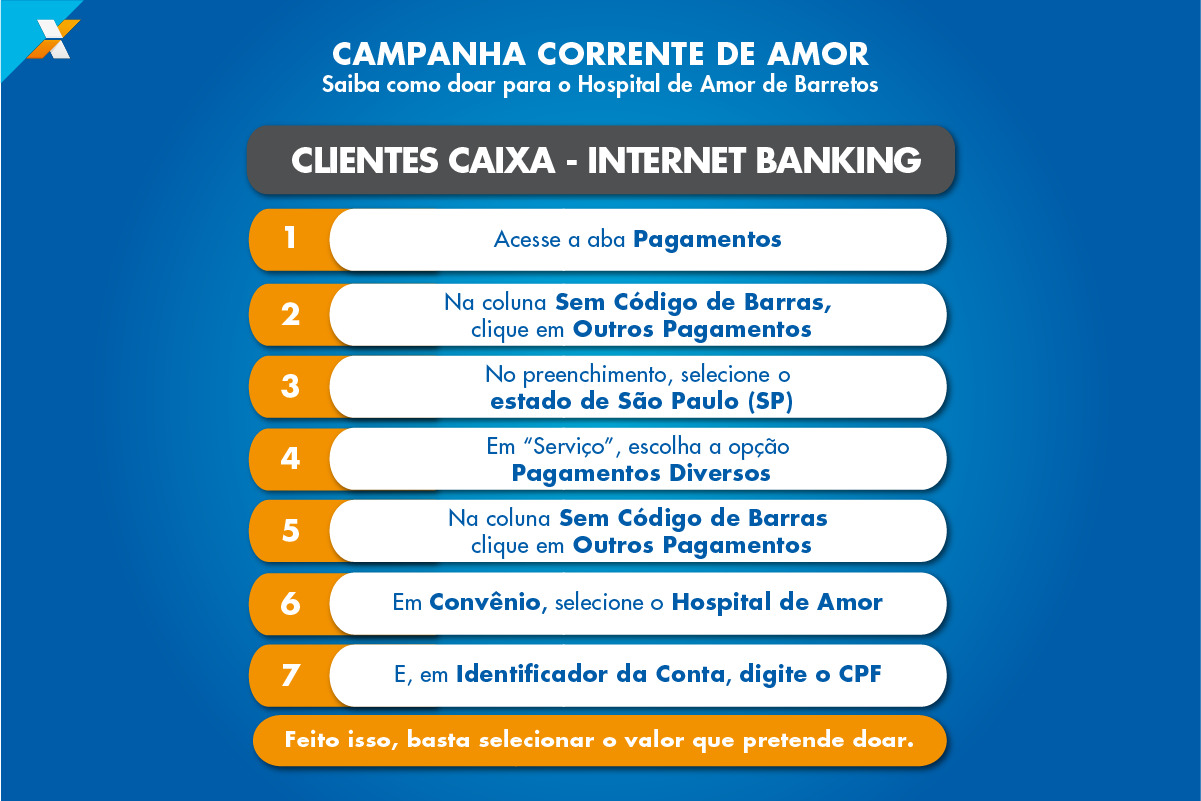 Clientes da CAIXA também podem fazer suas doações pelos caixas eletrônicos ou pelo Internet Banking CAIXA. Para doar por meio do Internet Banking, o cliente do banco deve acessar por um computador pessoal.