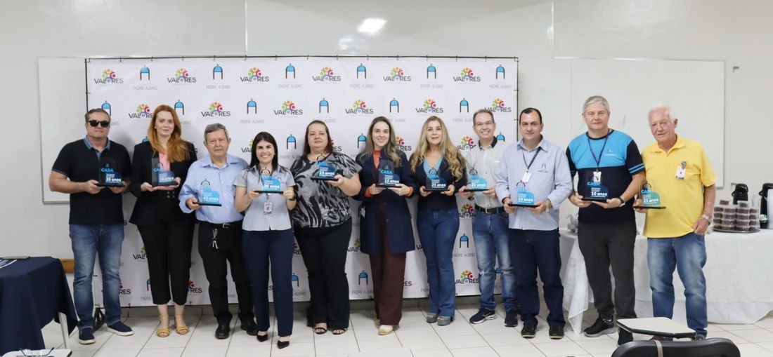 O projeto "Aniversário de tempo de empresa" da Fundação Padre Albino/FPA homenageou, com o troféu 'Você já é de Casa', 11 colaboradores que foram registrados no mês de agosto e que completaram de 10 até 45 anos de trabalho nas unidades de saúde e educação.