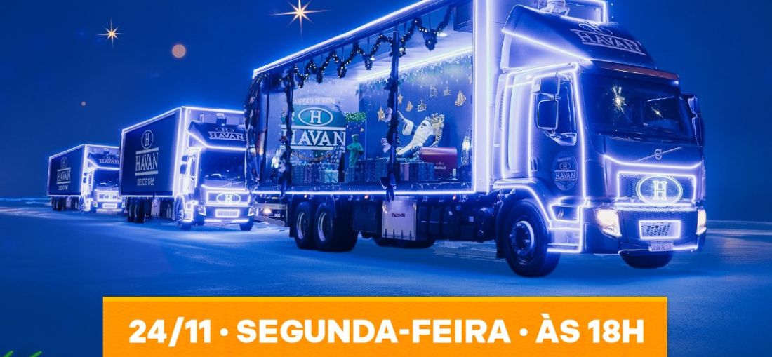 Catanduva se prepara para receber a 8ª edição da Carreata de Natal Havan nesta segunda-feira, dia 24. A tradicional ação natalina da varejista promete iluminar a cidade com seus caminhões cenográficos, todos decorados com luzes azuis e elementos temáticos, como mostra a divulgação oficial.