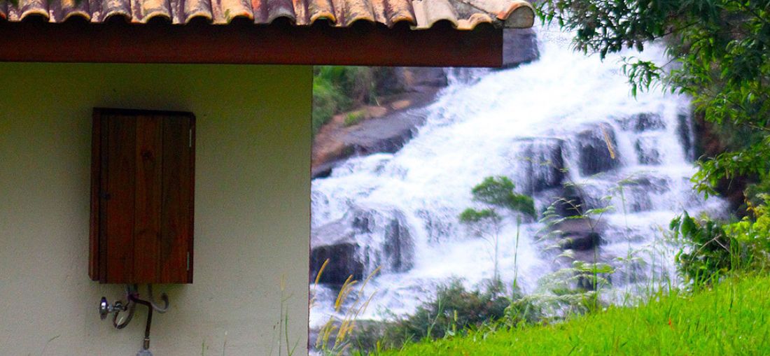 Espelho D´Água, localizada a 1.580m de altitude e a 1km do centro da pacata Gonçalves, tem chalés para hóspedes contemplarem cachoeira de camarote