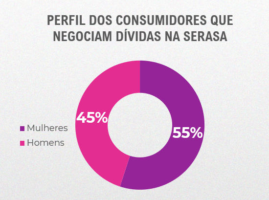 Em conformidade aos dados revelados pela pesquisa sobre A Relevância das Mulheres nas Finanças Brasileiras, o público feminino constitui a maioria entre os consumidores que negociam dívidas na plataforma Serasa Limpa Nome, a maior do país: em janeiro, as mulheres foram responsáveis por 55,45% do total de quitações.