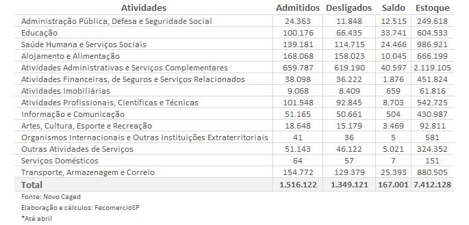 Nos Serviços, o quarto mês do ano terminou com a criação de 16.268 empregos. O resultado foi superior ao mesmo período do ano passado — quando foram registradas 4.137 vagas — e ao mês de março, quando foi observada a geração de 13.868 empregos.