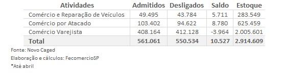 O varejo foi o segmento que liderou em número de vagas criadas em abril, com 2.627 empregos. Na sequência, o comércio atacadista, com 2.287 postos. Já a divisão de comércio e reparação de veículos automotores registrou 1.318 admissões a mais do que desligamentos. No varejo, que registrou o maior saldo, destacou-se o segmento de produtos farmacêuticos, com 1.016 vagas.