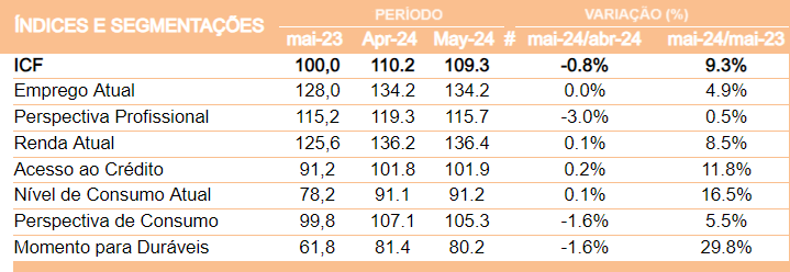 Todos os outros indicadores permaneceram estáveis: acesso ao crédito, nível de consumo atual, renda atual e emprego atual. Ainda assim, cresceram em comparação ao mesmo período do ano anterior, motivado pelo aumento da renda e pelo mercado de trabalho "aquecido" [tabela 1].