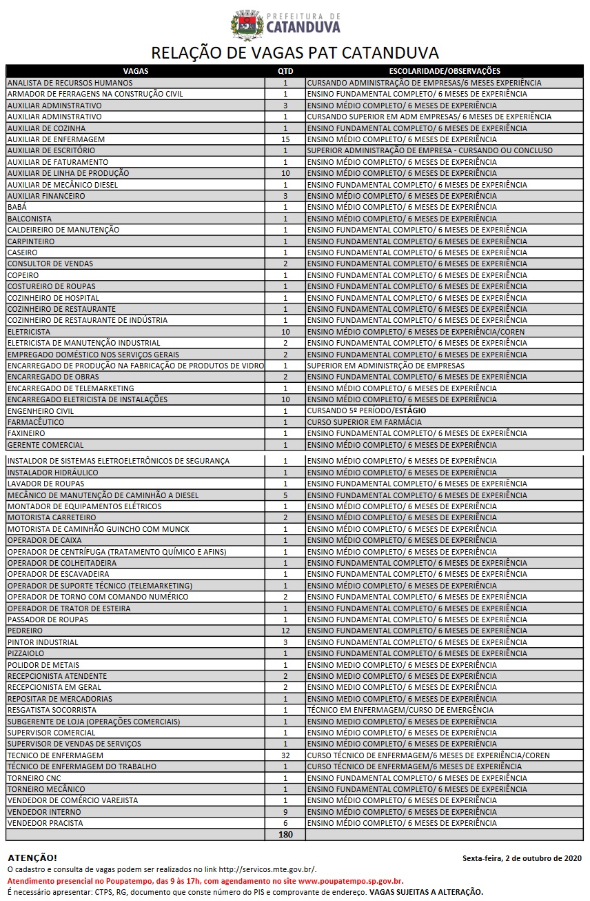 A Prefeitura de Catanduva divulga as vagas disponíveis no PAT – Posto de Atendimento ao Trabalhador.