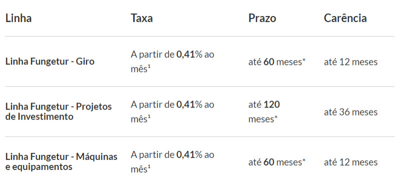 Através do Desenvolve SP, os recursos são disponibilizados por meio de linhas de crédito com condições facilitadas - taxas reduzidas e prazos estendidos. As empresas podem solicitar crédito para financiamento de projetos de investimento, aquisição de máquinas e equipamentos e capital de giro. As condições das três linhas Fungetur compreendem juros reduzidos de 0,41% ao mês e prazo estendido de até 120 meses, com até 36 de carência, além de garantia por meio do Fundo Garantidor e aval dos sócios.