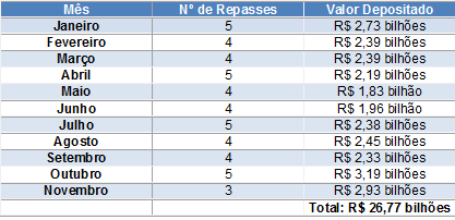 Nos onze meses deste ano, a Secretaria da Fazenda e Planejamento depositou R$ 26,77 bilhões aos municípios paulistas.