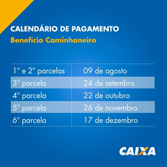 A CAIXA inicia, neste mês de agosto, o pagamento do Benefício Caminhoneiro e do Benefício Taxista. Os auxílios serão creditados em conta poupança social digital aberta automaticamente em nome dos beneficiários, com movimentação pelo aplicativo CAIXA Tem.