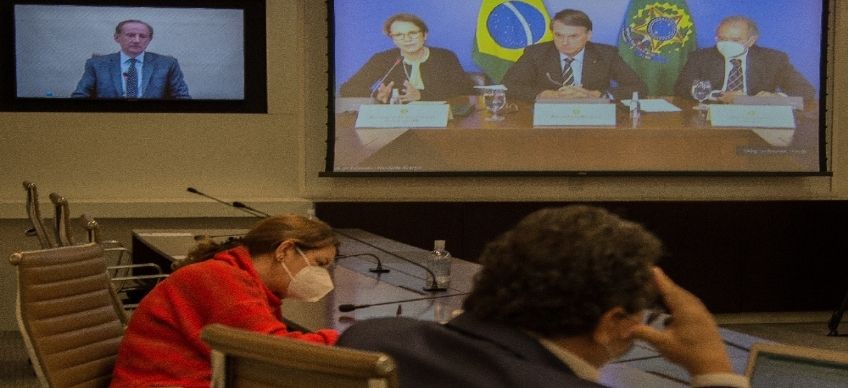 O presidente da República e dez ministros participam de videoconferência com o Conselho Diálogo pelo Brasil, que reúne os 50 maiores grupos privados e é coordenado pelo presidente da Fiesp/Ciesp, Paulo Skaf