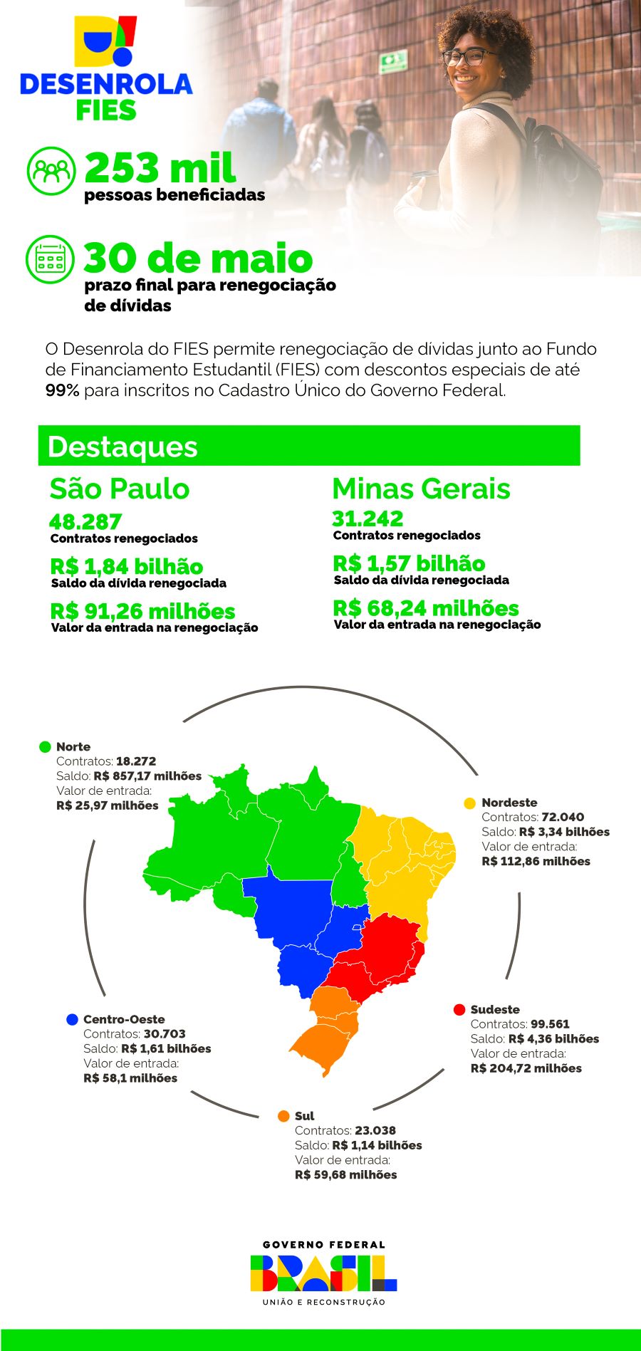 REGIÕES – O Sudeste foi a região com mais contratos fechados no Desenrola Fies. Somadas as negociações em São Paulo, Minas Gerais, Rio de Janeiro e Espírito Santo foram fechados 99.561 contratos, que tinham um saldo de dívida de R$ 4,36 bilhões e que resultaram em R$ 204,72 milhões arrecadados com os valores de entrada.