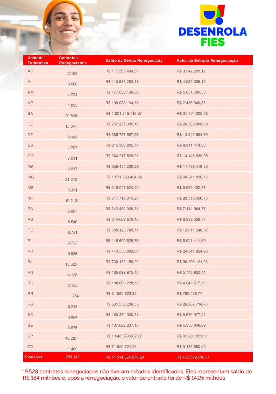 ESTADOS – São Paulo é a Unidade da Federação com mais contratos renegociados no Desenrola FIES até agora. O estado registrou 48.287 contratos. O saldo da dívida renegociada ultrapassou R$ 1,84 bilhão e, apenas com o valor de entrada da renegociação, o retorno aos cofres públicos foi de R$ 91,26 milhões.