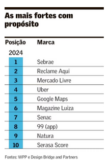 Luciana Cruz, curadora do curso Comunicação e ESG da ESPM, assinala que as dez marcas mais lembradas "têm conexão com pessoas de renda mais baixa e podem ser consideradas, de certo modo, 'populares'. Todas oferecem produtos e serviços acessíveis, para atender necessidades essenciais, seja de consumo, inclusão financeira ou oportunidade de crescimento profissional".