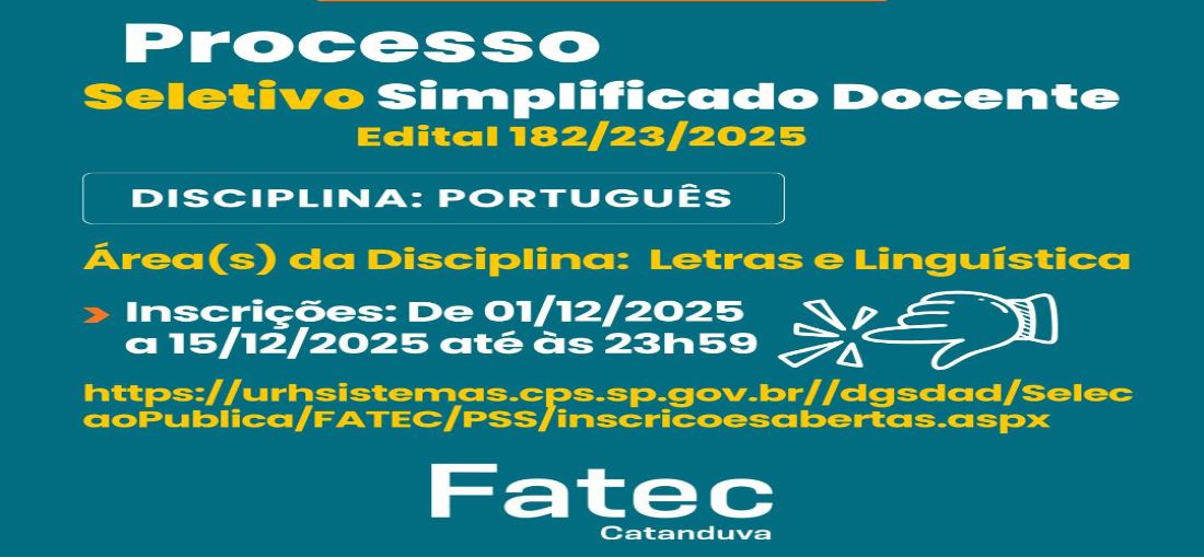 A Fatec Catanduva anunciou a abertura das inscrições para o Processo Seletivo Simplificado Docente, referente ao Edital 182/23/2025. A seleção é destinada ao preenchimento de vaga na disciplina de Português, vinculada à área de Letras e Linguística.