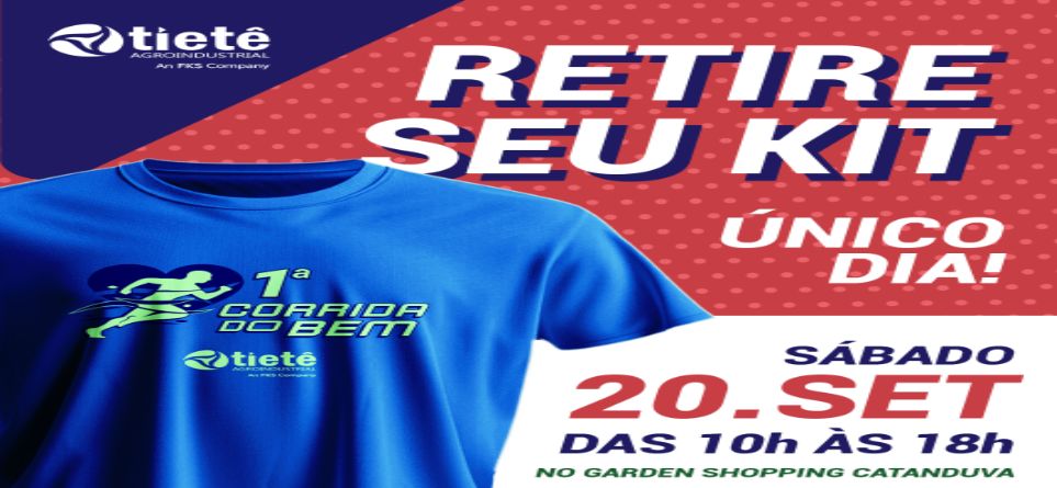 Os participantes da 1ª Corrida do Bem, promovida pela Tietê Agroindustrial em parceria com o grupo Km da Fé, poderão retirar seus kits no sábado, 20 de setembro, das 10h às 18h, no posto de atendimento do Garden Shopping Catanduva. A entrega será exclusivamente nessa data, mediante apresentação de documento de identidade ou comprovante de inscrição. A corrida acontece no domingo, 21 de setembro, com largada às 7h, no mesmo local, e oferece percursos de 5km, 10km e a Corrida Kids.