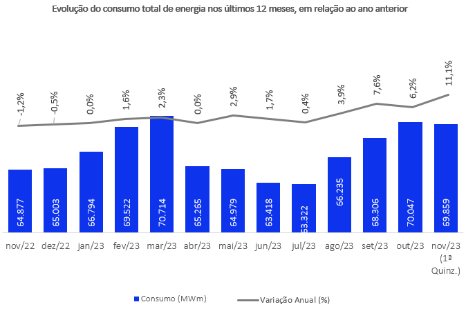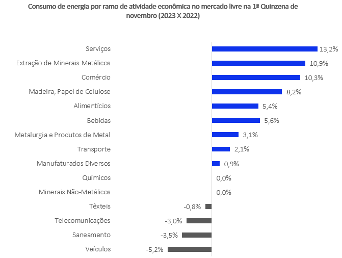 Entre os 15 setores com consumo monitorado pela CCEE no mercado livre, na primeira quinzena de novembro e na comparação com o mesmo período do ano passado, as maiores taxas foram observadas nos ramos de Serviços (13,2%), Extração de Minerais Não-Metálicos (10,9%) e Comércio (10,3%). Especificamente nos ramos de Serviços e Comércio, a CCEE destaca o uso mais intenso de equipamentos de refrigeração, especialmente nos segmentos de hotelaria, shoppings e hiper e supermercados, que têm maior peso nesses dois setores.