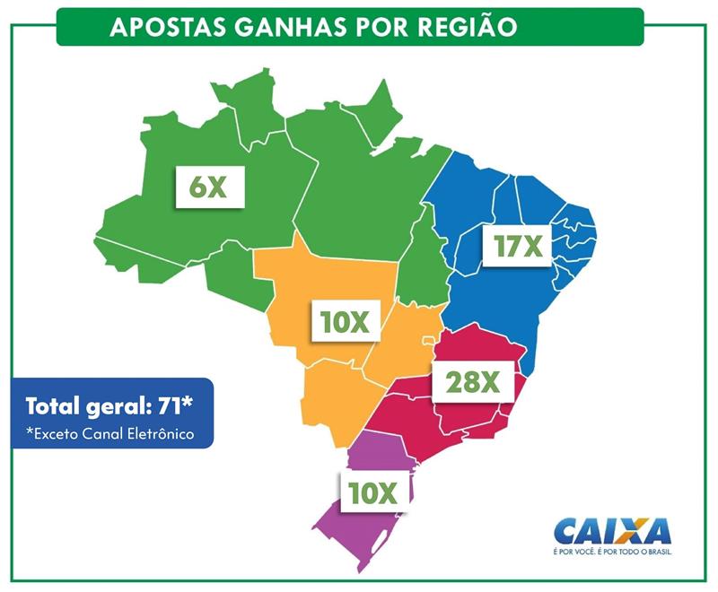 Essa é a 16ª vez que o sorteio especial do Ano Novo é realizado pelas Loterias CAIXA. Na história do concurso, a região Sudeste lidera os estados com maior número de apostas vencedoras, seguida do Nordeste e Centro-Oeste, respectivamente. São Paulo é a cidade com a maior quantidade de apostas vencedoras com 12 ganhadores ao longo da história do concurso. Em seguida, as cidades com mais ganhadores são Brasília, com oito vencedores e Rio de Janeiro com cinco apostas premiadas. Confira o mapa da sorte da Mega da Virada: