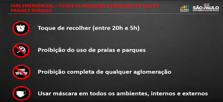 A partir do dia 15, o Governo do Estado determina toque de recolher nos 645 municípios todos os dias, entre 20h e 5h. Também fica vetado o acesso a parques e praias. Haverá proibição completa a qualquer tipo de aglomeração, e o uso de máscaras deve ser intensificado em qualquer ambiente interno ou externo de acesso público.