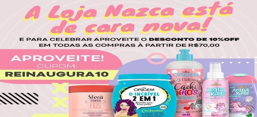 Para celebrar a beleza e o novo visual do site a Nazca Cosméticos preparou um desconto especial, válido nas compras acima de R$70