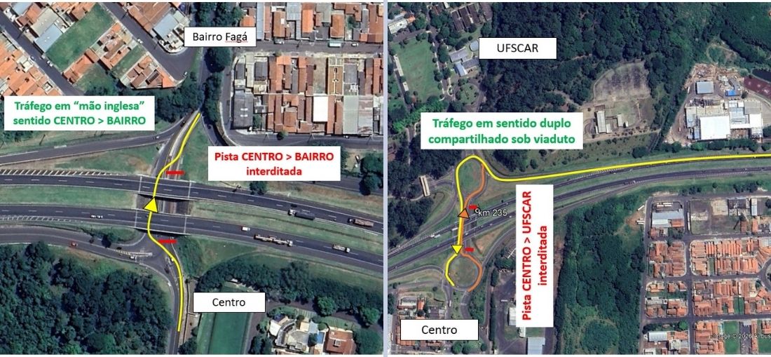 O tráfego nos viadutos do bairro Maria Stella Fagá (quilômetro 231+800m) e da Vila Brasília/Country Club (quilômetro 234), ligações com a Rodovia Washington Luís (SP-310), em São Carlos (SP), sofrerá interdições e alterações temporárias a partir da próxima segunda-feira (02/02).