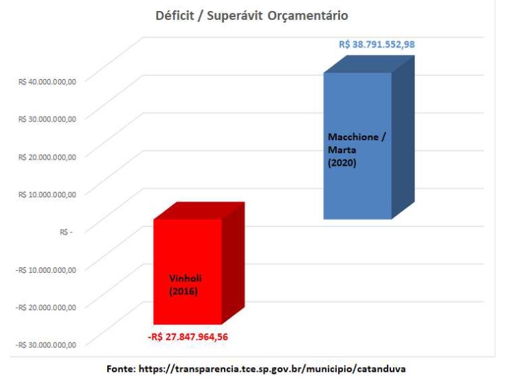 Bem diferente do último ano da administração Vinholi, em que a prefeitura de Catanduva amargou um déficit de mais de R$ 27 milhões, a Prefeita Marta entregou a Prefeitura ao seu sucessor, padre Osvaldo, com dinheiro em caixa.