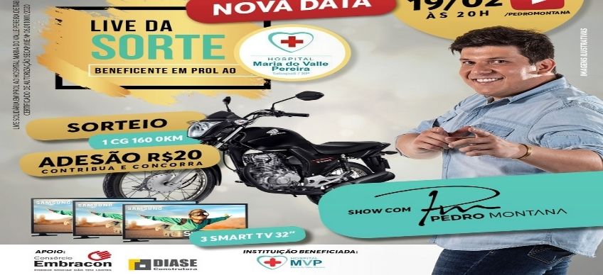 A Live da Sorte beneficente em prol ao Hospital Maria do Valle Pereira, da cidade de Tabapuã, será adiada para o dia 19 de fevereiro em razão do cantor Pedro Montana ter sido diagnosticado na quarta-feira (13), com o novo coronavírus.