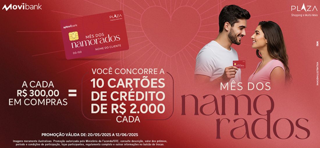 A data mais romântica do ano, o Dia dos Namorados, será recheada de prêmios no Plaza Shopping. Isso porque os clientes terão a oportunidade de concorrer a dez cartões de crédito Movibank, com saldo de R$2 mil em cada.