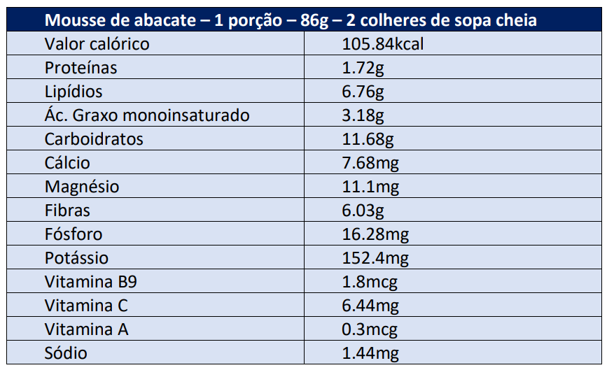 "A mousse de abacate é uma receita com diversas propriedades nutricionais. Como o alimento principal é o abacate, fonte de diversas vitaminas, minerais e fitoquímicos, serão essenciais para o nosso organismo, por desempenharem um papel anti-inflamatório e antioxidante".